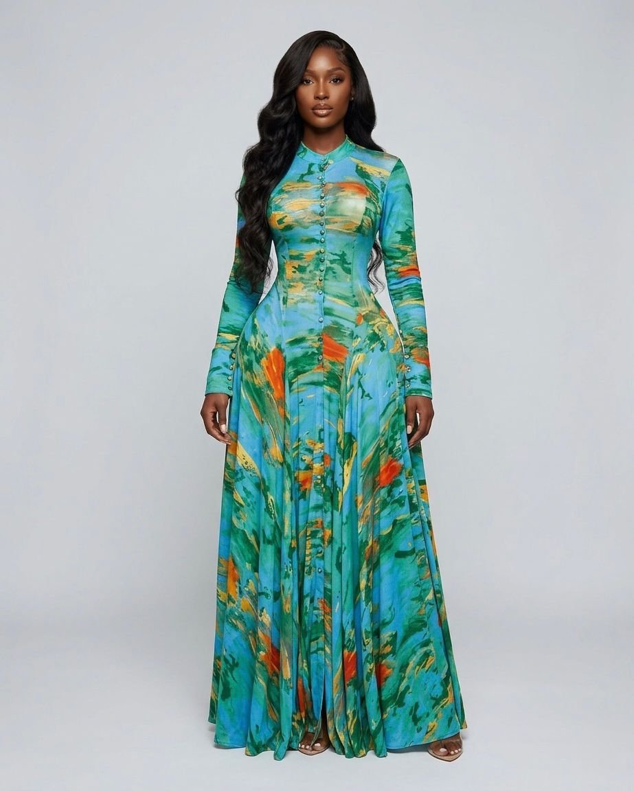 O-neck Full Sleeve Big Swing Tie Dye Print Long Dress